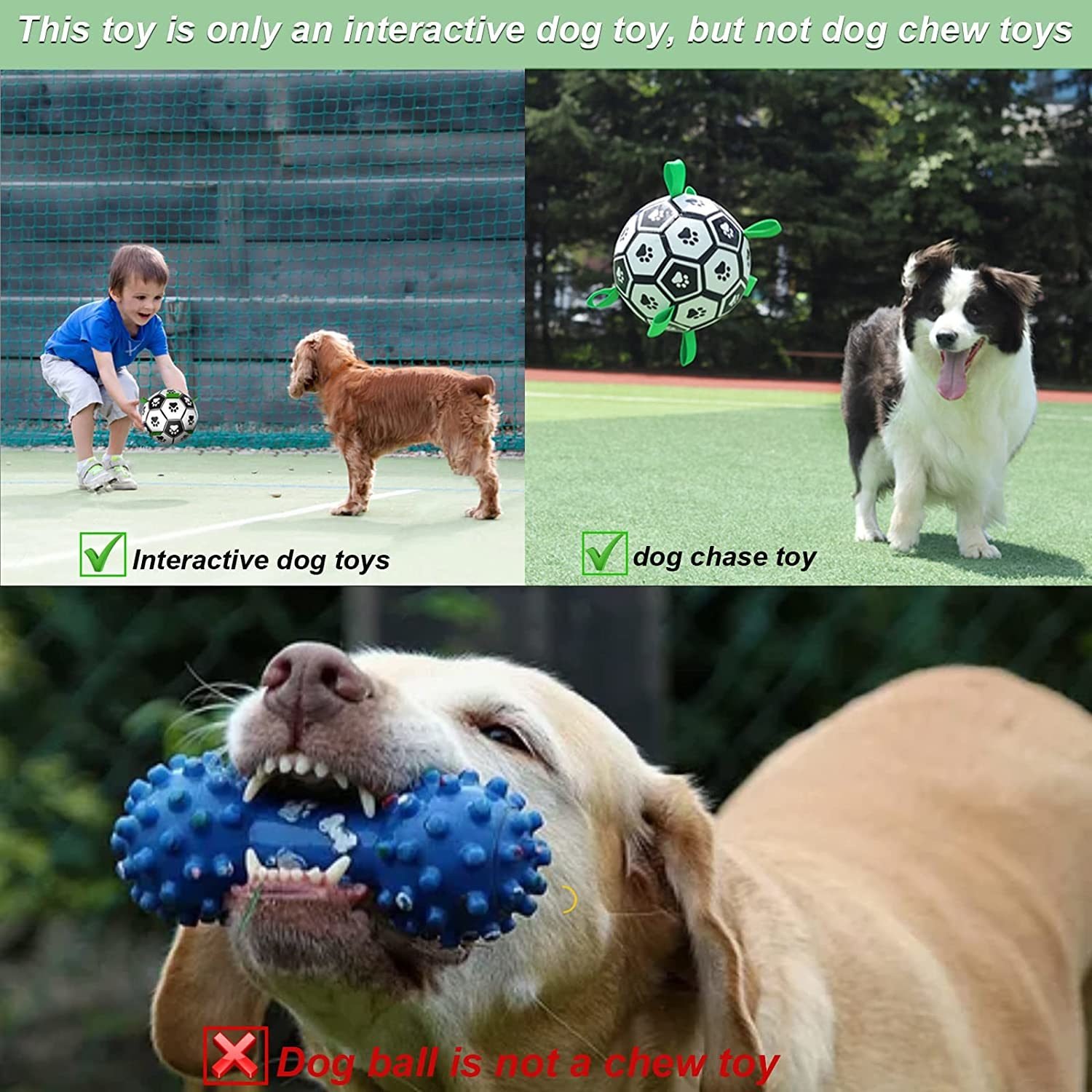 Interactive dog toys: Dog soccer ball can not only help your dog fight anxiety,depression and boredom,reduce mischievous behaviour and provides long-lasting entertainment,but also enhance good relationship between you and your pet by interactive outside game. Dog balls are not only a jolly dog toy, but also cute cat toys.Durable Puppy Toys Soccer Ball with grab tabs: Dog football is made of high quality PU,pure cotton yarn rubber lining and nylon materials, anti-bite, very strong and durable for not a chewer. The nylon tabs design make it easier for the dogs to fetch, toss, tug and retrieve. It is best dog toys to keep them busy,suitable for indoor and outdoor use.There's a longer handle for people to hold onto the ball to train your dogs.Floating Ball Toy for Dogs: Puppy toys interactive football is waterproof,no water absorption,no seepage, no deformation,lightweight,easy to float in water, so whether it is on the lawn, beach, swimming pool, lake, inside or outside, you can enjoy happy time with your pet dogs. It is a great dog water toy.Pump and Needle Adapter Included: There's a needle point adapter and a pump inside.The balls for dogs comes deflated. so you'll have to pump it up with the supplied pump and pin. Simply remove the needle from the pump handle, screw it into the pump, and pump up the ball until dog ball is full. The dog fetch ball provides hours of fun both indoors or out.Pls kindly note: The dog toy ball is only dog toys interactive ,it is not meant for a dog to bite unless only directly on the tabs, so the soccer ball for dogs is not suitable for aggressive chewers. Dog soccer ball with grab tabs is 6 inches in diameter, perfect for small & medium pets about 20-60 lbl. The package include 1xball, 1xpump, 2xneedles, 1x instruction manual .