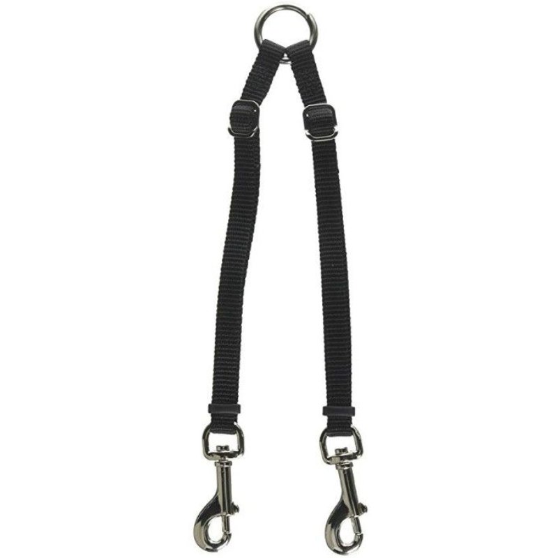 The Coastal Pet Two Dog Adjustable Nylon Coupler in black allows you to walk two dogs at once! Constructed with all metal hardware and sturdy nylon, this coupler easily attaches to the end of a single lead and instantly converts it to a double dog walker. Designed to accommodate several size dogs. Adjust each side independently.
