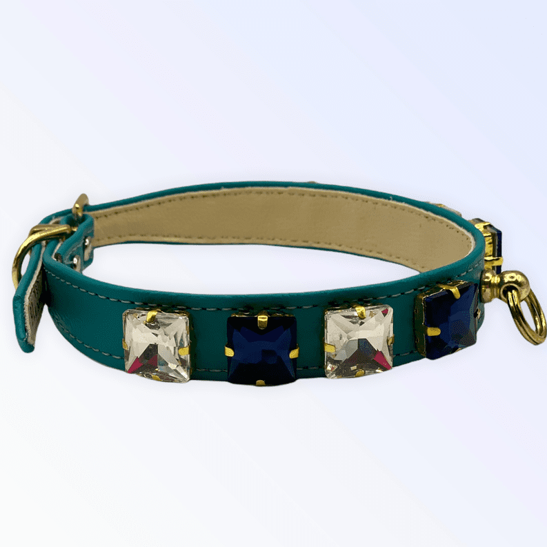 Add a little glitz and glam to the holiday season!All of our collars, pet jewelry, and accessories are made from vegan leather, which is cleaned and buffed to grip a high-grade adhesive. Every pearl, rhinestone, and gem are hand placed and left to be cured for 48 hours to reach its strength bond. From there, we ensure all gems are fully attached and then the collar is placed into its duster bag where they remain until shipping. Each collar takes approximately 1.5 hours to create, and 48 hours to fully dry. Glass Diamond rhinestonesSquare shapesize: 14mmMaterial: Glass Diamond Rhinestone Crystals