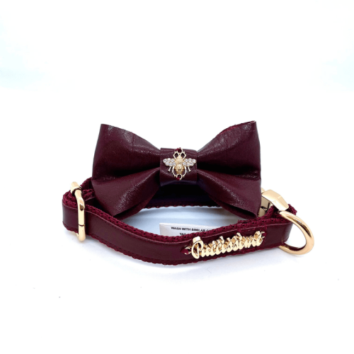 "Crafted from only the most luxurious vegan leather, each piece in this collection is made to a strictly limited run, so exclusivity is guaranteed." The burgundy leather collar is not only a unique piece of art, it's also elegant, luxury and posh.